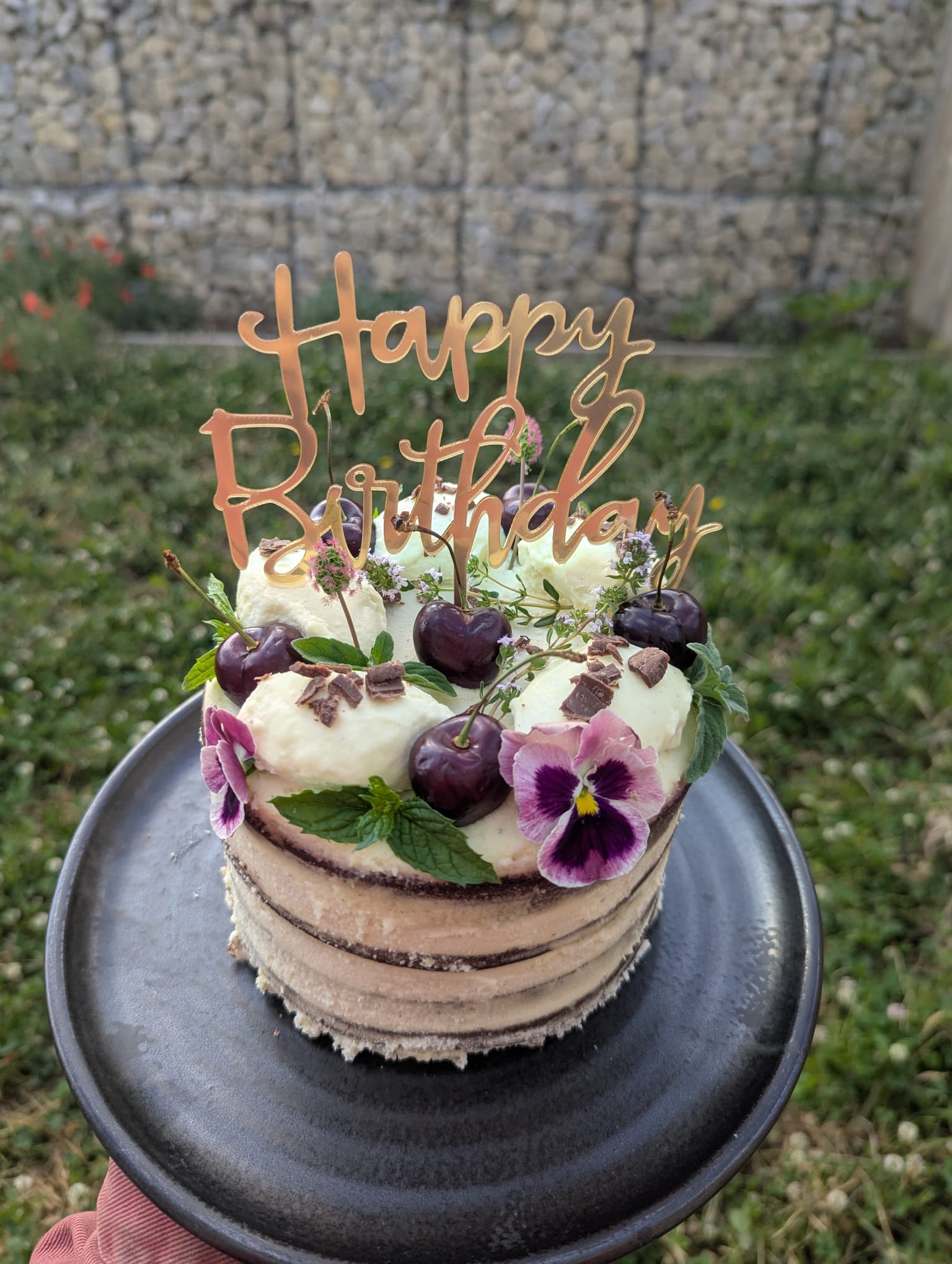 Chocolate fudge cake with cherry jam, fresh cherries, and mascarpone vanilla buttercream for James' birthday.
