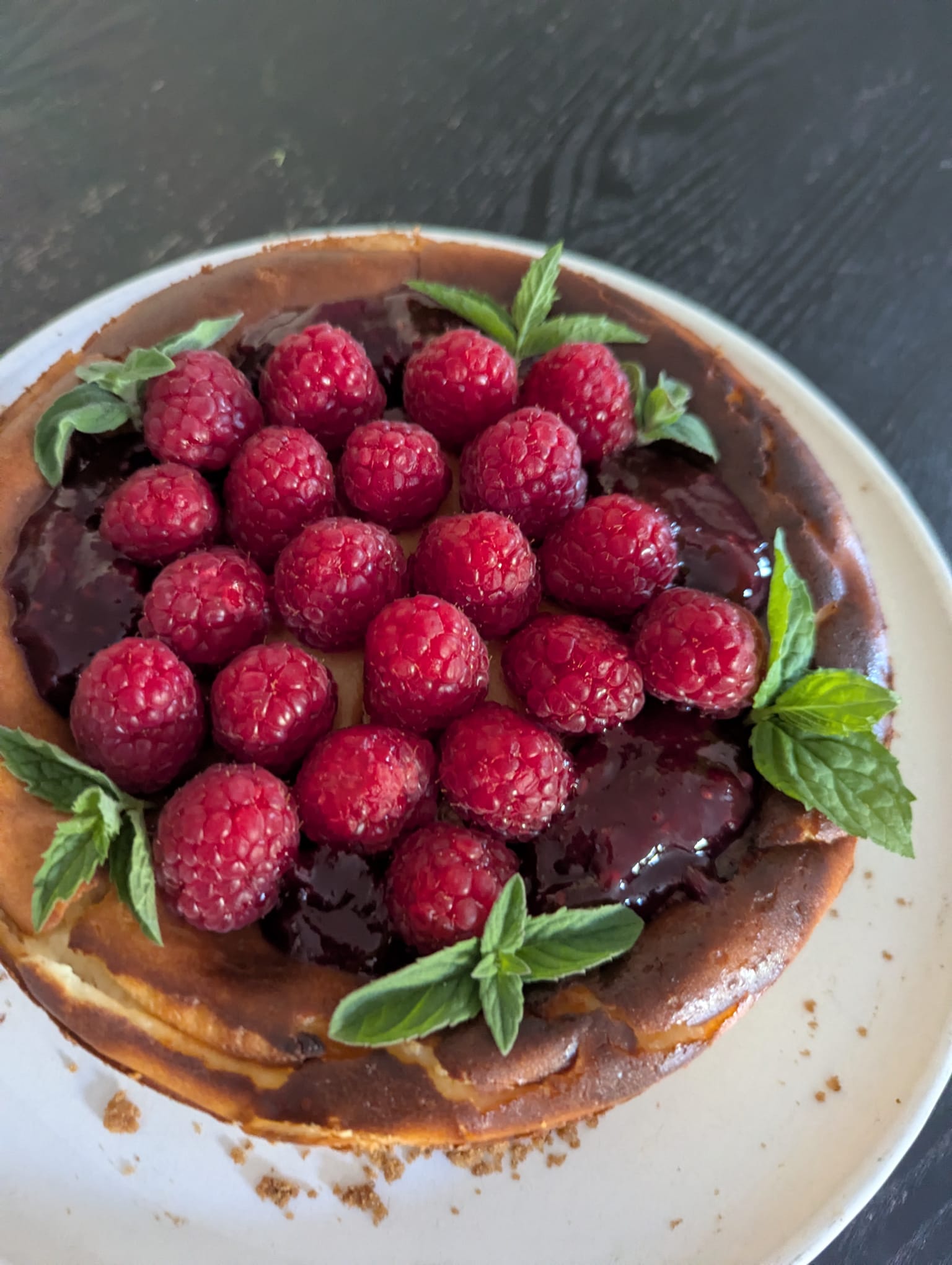 Ricotta and mascarpone cheesecake topped with fresh raspberries, for Ned's birthday.