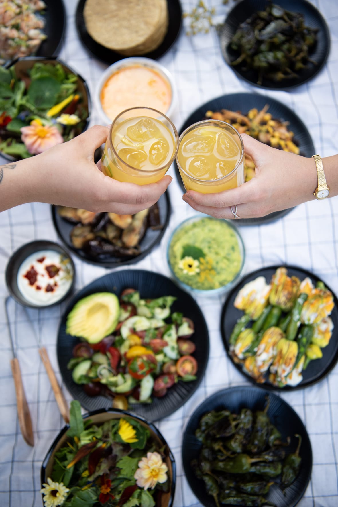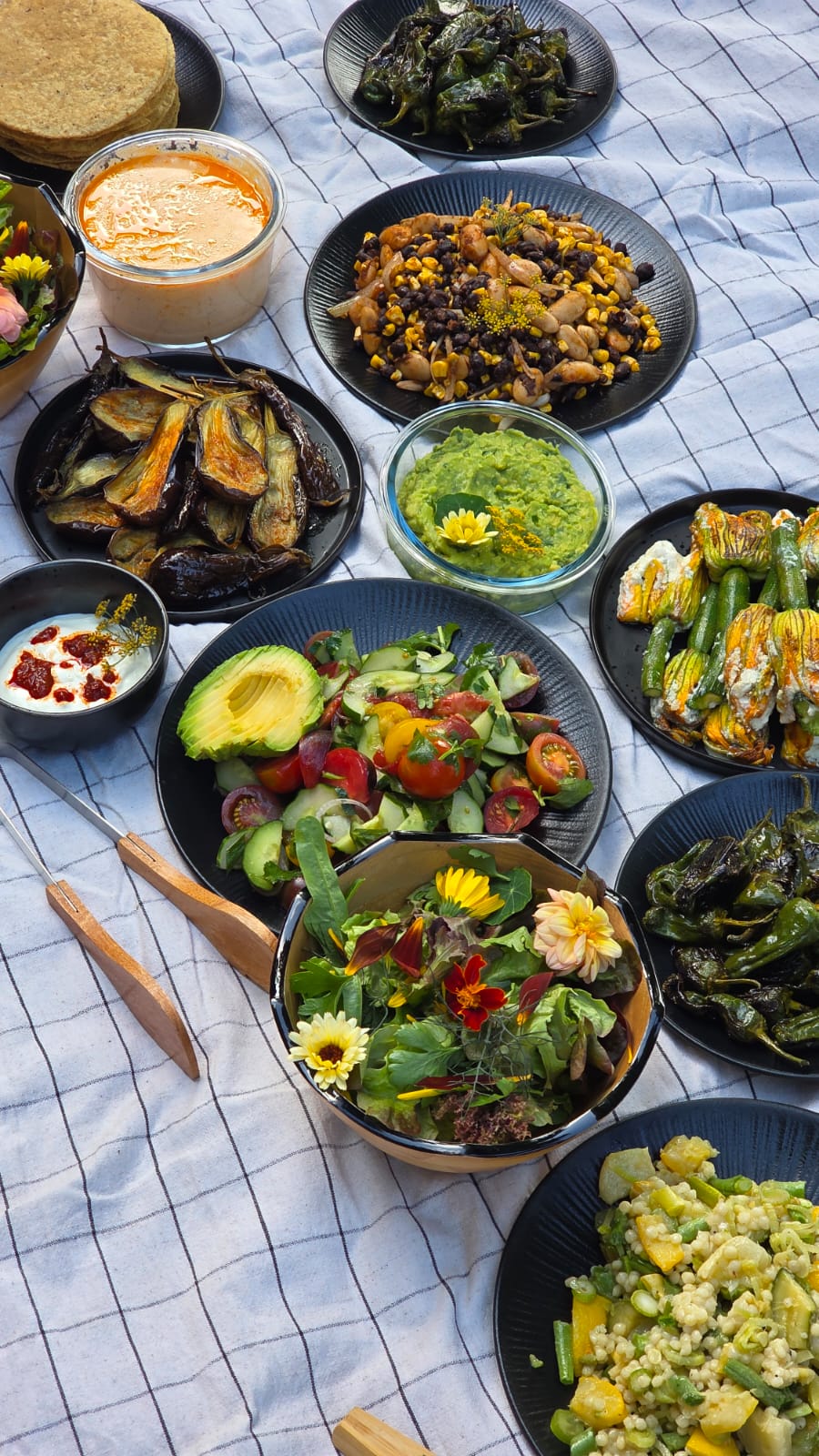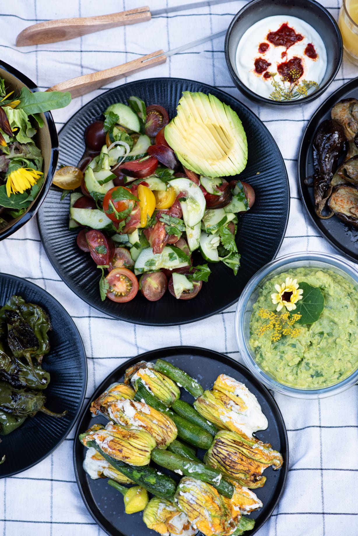 Charred padron peppers, rainbow salad, guacamole, courgette flowers stuffed with ricotta and lemon, garlic yoghurt with harissa, tomato aguachile.